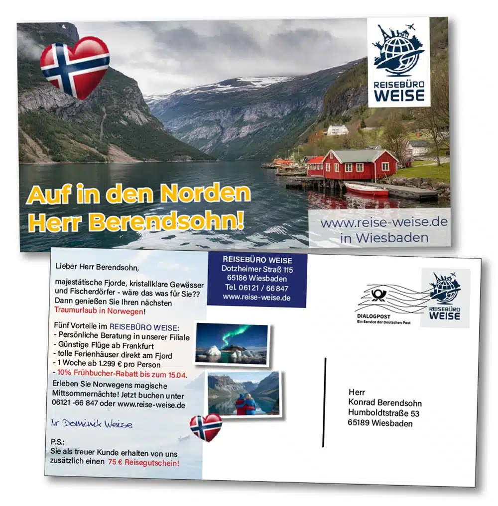 Zwei Empfänger – zwei völlig unterschiedliche Träume. Beide erhalten eine Maxipostkarte vom Reisebüro Weise, aber was sie sehen und lesen, ist so verschieden wie Norwegen und Griechenland: